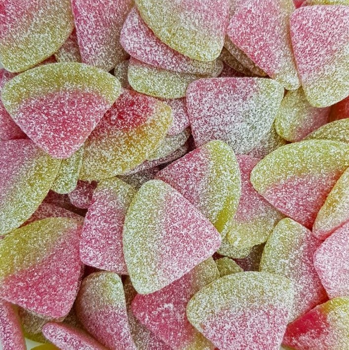 Gommes bicolores légèrement acidulées au goût de pastèque.