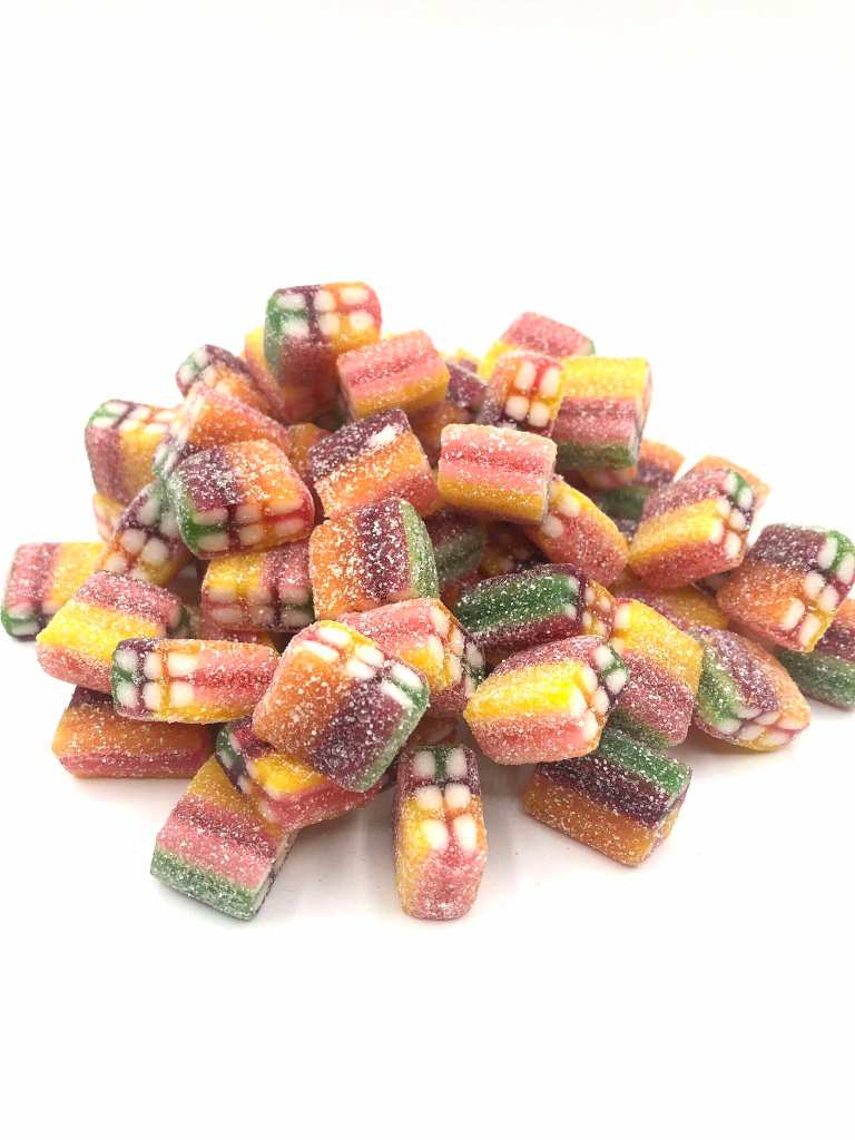 Petits carrés acidulés rouges, jaunes et verts au goût fruité.