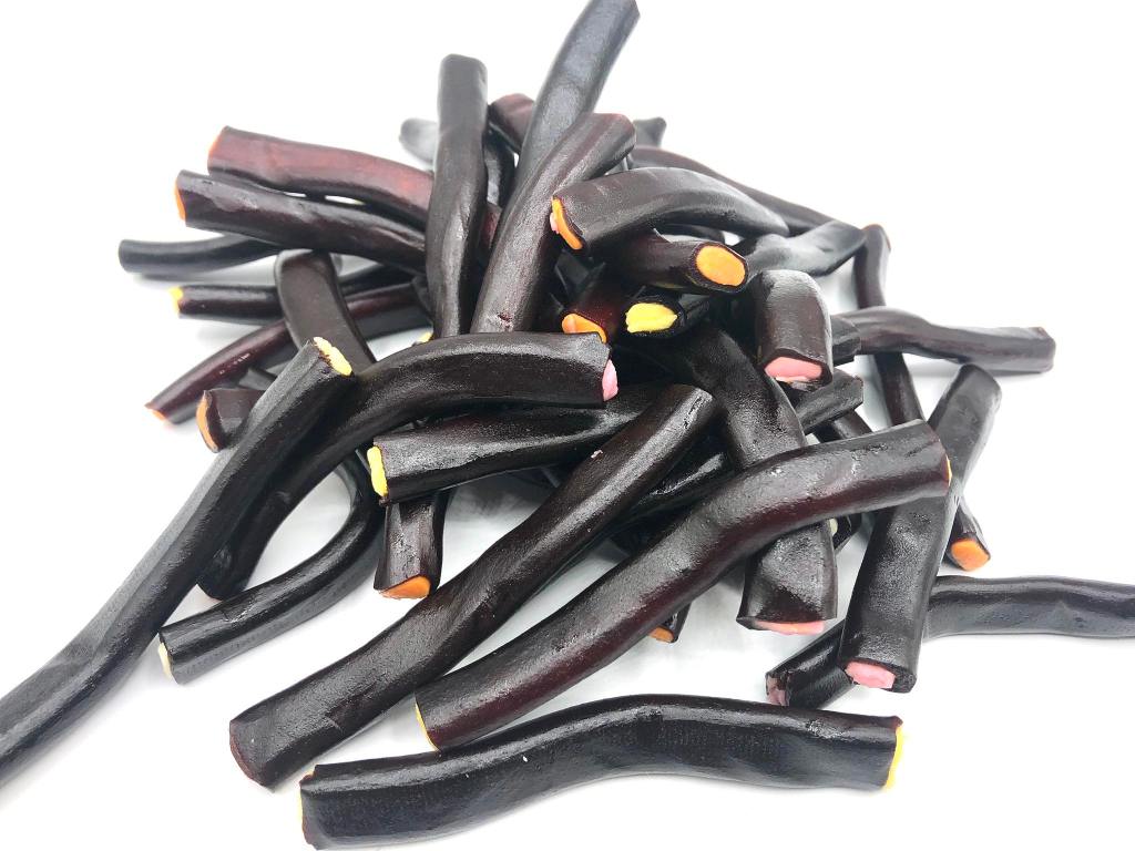 Bâtonnets à base de framboise, noix de coco, jus d’orange et citron avec un enrobage de réglisse épicé.