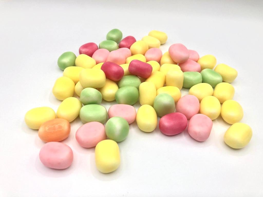Bonbons moelleux enrobés avec un pétillant dans le noyau au goût fruité: fraise, framboise, pomme, orange et citron.