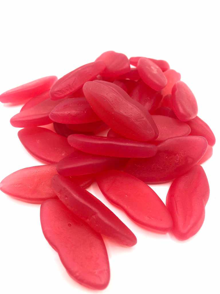 Bonbons gélifiés lisses à la forme de dentier au goût de fraise.