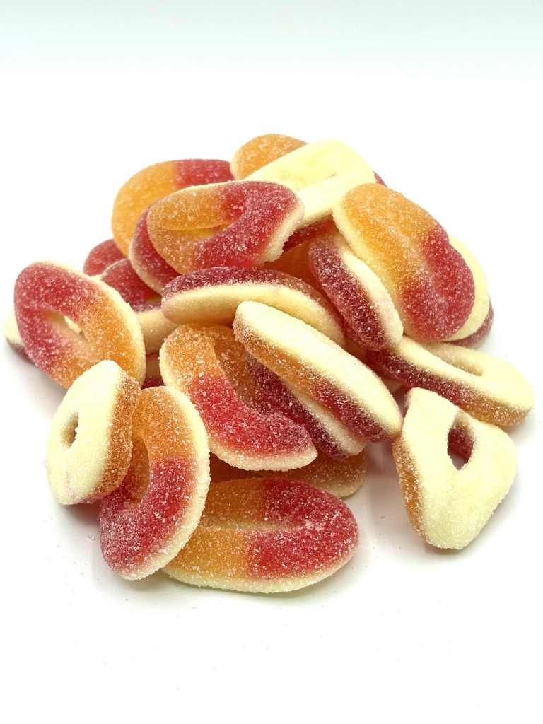 Gommes en forme d’anneaux, sucrées au délicieux goût de pêche.